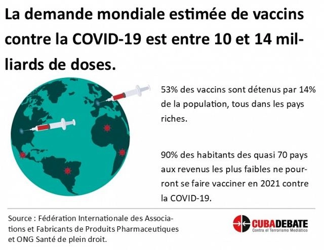Les pays à faible ou moyen revenu qui regroupent 84 % de la population mondiale, ont conclu des accords directement avec des sociétés pharmaceutiques, mais n’ont jusqu’à présent obtenu que 32 % de l’approvisionnement.