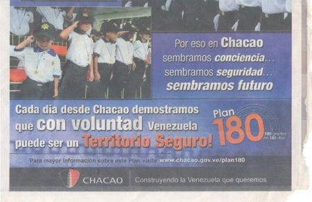 (Brigade Policière Juvénile - Publicité de la mairie de l’arrondissement Chacao ( opposition à Chavez) paru dans l’édition du 21/08/06 du quotidien Ultimas Noticias, p. 16.)