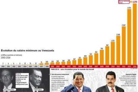 En janvier 2014, le président Maduro a décrété une nouvelle augmentation de 10 % du salaire minimum, ce qui en fait le plus élevé d’Amérique Latine. De mai 2013 à janvier 2014 celui-ci a augmenté au total de 59% pour s’établir actuellement à 3270 bolivars. Parallèlement les droits des travailleurs vénézuéliens ont été renforcés par une nouvelle loi du travail qui a brisé le carcan néo-libéral (1).