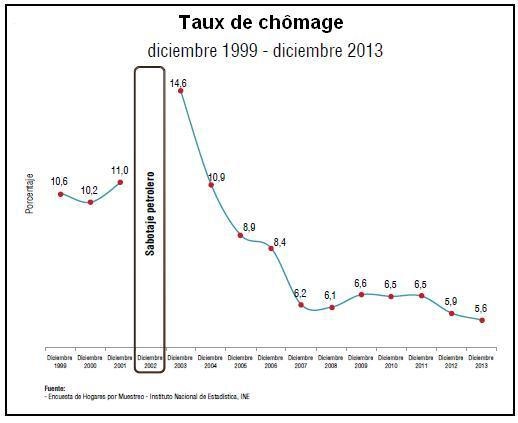 Occultés par les médias privés vénézuéliens et leurs relais internationaux (Le Monde, El Pais, Libération, NY Times, etc..) les chiffres révélés en janvier 2014 par l’Institut National de la Statistique indiquent une nouvelle baisse du chômage, tombé à 5,6% en décembre. Ce chiffre est le plus bas enregistré par le gouvernement bolivarien (rappelons que le chômage atteignait 11% lors de l’élection de Hugo Chavez en décembre 1998).