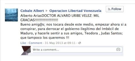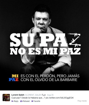 Ses réunions avec la principale force d’opposition au gouvernement de Santos et à la paix négociée avec les FARC se voit abondement reflétée sur son profil tweeter personnel dans lequel il n’hésite pas à qualifier le processus de paix dirigé par le président Juan Manuel Santos de trahison. En plus, il y célèbre la destitution du maire de Bogota, Gustavo Petro, le 9 décembre 2013.