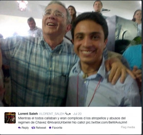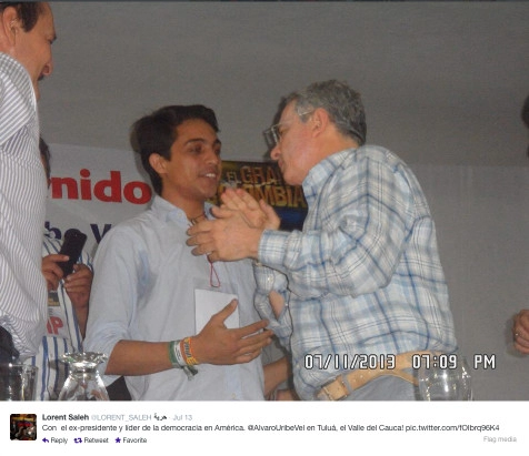 Saleh leader étudiant de 26 ans, a été un visiteur assidu de la Colombie où il s’est réuni par le passé avec plusieurs des membres les plus représentatifs de l’Uribisme et de la droite colombienne comme Pablo Victoria Wilches, José Obdulio Gaviria, Francisco Santos et l’ex président Uribe Velez lui-même.