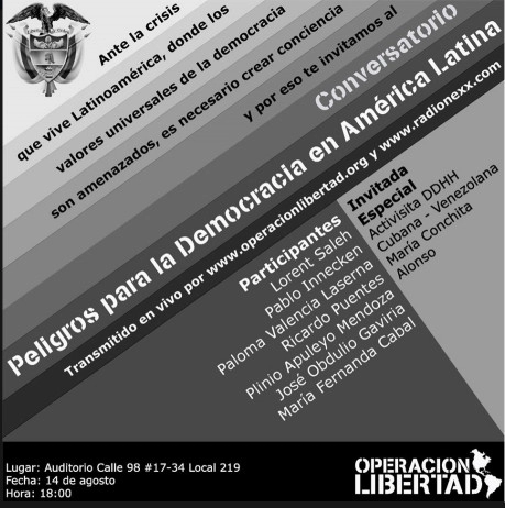 Les relations avec l’uribisme ne se limite pas à des photos et des réunions, le 14 août 2013, Operacion Libertad a tenu un séminaire sur la démocratie en Amérique Latine en présence de Maria Fernanda Cabal, candidate à la Chambre du Centro Democratico, l’extrêmiste de droite, Ricardo Puentes Melo et le candidat au Sénat, José Obdulio Gaviria, parmi d’autres notables dirigeants de la droite