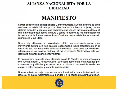 A la fin de la semaine dernière, le journaliste Gustavo Rugeles a publié des photos du lancement, à Bogota, le 6 juin dernier, d’un mouvement qui se fait appeler Alliance Nationaliste pour la Liberté. Saleh assistait à cet événement ainsi que Pablo Victoria Wilches , dirigeant conservateur, et une des figures visibles du mouvement néonazi Tercera Fuerza. Dans le manifeste de l’Alliance ont peut lire qu’ils sont « Antisionistes, Anticapitalistes et Anticommunistes... et en plus on peut lire sur leur compte Facebook, qu’ils se sentent personnellement visé par le « No Pasaran » lancé par le maire Gustavo Petro contre le fascisme et qu’il constitue un défi les concernant. Ils présentent également des activités de plein air au cours desquelles sont menées des formations politiques et paramilitaires.