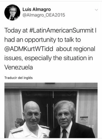 Luis Almagro coiffant une casquette vénézuélienne, en compagnie de J.J. Rendon, spécialiste en guerre psychologique et conseiller en communication de l’ex-président colombien Alvaro Uribe, lors d’un séminaire sur « marketing et gouvernance politiques en Amérique Latine » organisé à Miami. L’ex-président uruguayen José Mujica a dénoncé son ex-chancelier Almagro : « ce qu’il fait est dangereux non seulement pour le Venezuela mais pour tout le continent ». (1) Pour sa part le président bolivien Evo Morales a déclaré « Almagro doit respecter les principes de l’OEA. On ne comprend pas ce que fait l’OEA contre le Venezuela » (2)