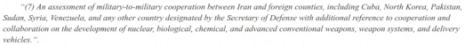 Dans le « sous-titre C. Questions concernant la Syrie, l’Irak et l’Iran, » (Subtitle C—Matters Relating To Syria, Iraq, And Iran) du « titre XII Questions concernant les pays étrangers » (Title XII—Matters Relating To Foreign Nations), le texte du projet de loi budgétaire cite le Venezuela comme un pays qui coopère avec l’Iran dans le domaine militaire. Pour cela,il demande que le Venezuela soit évalué en termes militaires par le Secrétaire à la Défense, James Mattis et qu’il prenne en compte que l’Iran, avec la Russie, la Chine et le Venezuela , font partie du bloc de pays émergents qui remettent en question l’hégémonie états-unienne sur le monde.