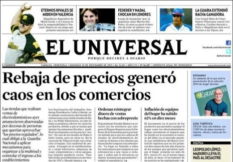 En revanche, il y en a quatre qui sont notoirement pour l’opposition. Ce sont El Nacional, Tal Cual, El Pais, El Universal et le magazine Zeta . Le quotidien Últimas Noticias est considéré comme neutre, alors qu’à la télévision la répartition se présente de la même façon : six pour l’opposition et six progouvernemental.