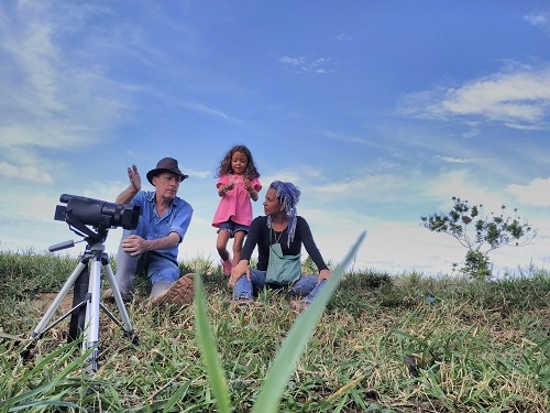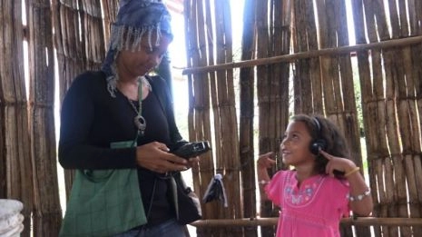 Photo : l’auteur avec Betzany Guedez formatrice et réalisatrice de Terra TV et sa fille. Campement « Hugo Rafael Chavez Frias », Alto Apure, Venezuela, octobre 2019.