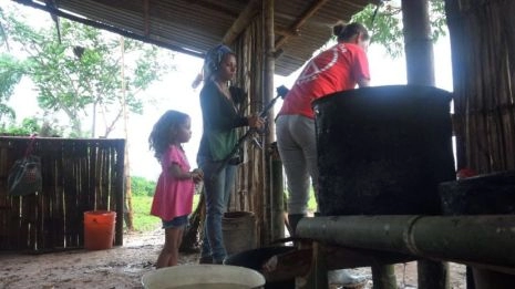 « Nous n’avions pas de terres mais ici nous pouvons offrir un futur à nos enfants. C’est ce qui nous a motivées à participer en tant que mères. Ils ne tomberont pas malades comme dans les villes. Ici, ils apprendront à partager, à être humbles et respectueux » raconte Maria. « Ouiiii ! Ouiiii ! » font les machettes qu’on affûte sur la pierre plantée entre deux churuatas, cabanes en forme d’étuves, faites de palmes, planches, zinc et bambou. L’une sert aux paysan(ne)s de salle de réunion et de dortoir, l’autre de cuisine. « C’est dans cette casserole qu’on a cuit le poisson ? » « Oui, ne jette pas l’eau ! » Hommes et femmes de garde travaillent sans relâche à nourrir le collectif. A cheval ou à pied, paysan(ne)s et fonctionnaires de l’Institut National des Terres – qui sont ici des alliés – vont et viennent du camp de base à la terre en friche pour démarquer les lots assignés aux 107 familles. Après quinze ans d’attente, chaque agriculteur aura droit à neuf des 1200 hectares abandonnés. « 10% au moins de la zone restera vierge pour préserver la biodiversité » précise un des ingénieurs de l’Institut des Terres. Erigé il y a dix mois au cœur de l’Alto Apure, le campement « Hugo Rafael Chavez Frias », témoigne d’une grande force d’organisation et d’une grande patience…