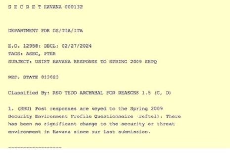 D’autre part, des 2080 rapports envoyés depuis La Havane et qu’El Paàs a eu connaissance, le quotidien espagnol n’a publié qu’une ligne d’un de ces rapports, diluée au milieu d’appréciations sur Cuba, extraites d’autres rapports provenant d’Ambassades nord-américaines à Caracas et à Bogotá. Cette unique ligne vient d’un rapport daté du 27 février 2009 et signé par Jonathan Farrar, chef de l’Agence des Intérêts des États-Unis. Il s’agit d’un Questionnaire sur le Profil du Climat de Sécurité, (SEPQ) comme dénommé par le Département d’État, datant du printemps 2009 à Cuba :