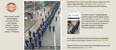 * dans une vidéo devenue virale en 2020, on prétendait que des Ouïghours menottés et les yeux bandés étaient conduits par des policiers. Il s’agissait en fait d’une vieille vidéo d’une autre province (Guizhou) où des non-Ouïghours (des Han) avaient « été capturés dans un cas de fraude financière massive (du genre pyramide)