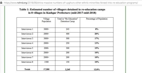 Alors que l’accord commercial était au point mort, les États-Unis ont augmenté la mise et porté le nombre de détenus à un million ! Ceci était basé sur une fausse étude d’un autre groupe du gouvernement américain financé par le NED, appelé China Human Rights Defenders (CHRD), qui a travaillé avec un Allemand nommé Adrian Zenz - un fanatique religieux chrétien d’extrême droite - et qui est arrivé au chiffre d’un million. Ils sont arrivés à cette conclusion douteuse après avoir (prétendument) interrogé HUIT personnes ! En gros, allez parler à des séparatistes dans des villages reculés, obtenez de belles estimations rondes (250, 500 etc.), et extrapolez/multipliez pour l’ensemble de la population ouïghoure ! Remarquez aussi qu’ils ne révèlent même pas le nom des villages. Comment les fonctionnaires chinois peuvent-ils vérifier ou réfuter ce travail bâclé ? C’est absurde, sans la moindre logique ou objectivité ! Voici le lien vers l’étude et une capture d’écran des "chiffres" :