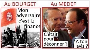 PS. La déclaration exacte de Flamby au Bourget, le 22 janvier 2012, est : « Je vais vous dire qui est mon adversaire, mon véritable adversaire. Il n’a pas de nom, pas de visage, pas de parti, il ne présentera jamais sa candidature et pourtant il gouverne. Cet adversaire, c’est le monde de la finance. » (Hourras et applaudissements frénétiques des gogos de la tribu du Votutil).