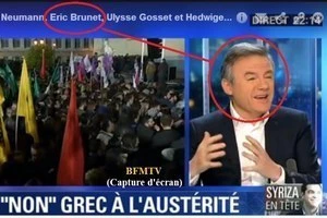 Dimanche, BFMTV. L’éditorialiste Eric Brunet, fou furieux de la victoire de Syriza, crache pendant 2 minutes sur un pays et un peuple, sur la triste (répété 2 fois) tragédie (répété 3 fois), sur la lâcheté historique de la Grèce , sur la lâcheté collective des Grecs (textuel !) qui ont triché honteusement naguère et qui viennent d’élire un démagogue poujadiste qui insulte l’Europe (cocue) et lui fait un bras d’honneur. C’est ici entre 6mn30 et 8mn48.