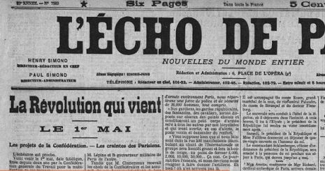 « La révolution qui vient ». En ce 27 avril 1906, le titre barre la une du quotidien L’Echo de Paris, que cette perspective n’enchante guère. Échaudées par deux mois de propagande du ministre de l’Intérieur, les forces conservatrices du pays s’inquiètent du déroulement de la manifestation du 1er mai. L’ennemi numéro un s’appelle, déjà, la CGT :