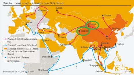 Enfin, il faut savoir (sinon on ne comprend rien à la situation au Xinjiang), que la Chine est engagée dans de gigantesques travaux de construction d’une « Route de la Soie terrestre et maritime du 21eme siècle » (3), qui reliera la Chine à l’Asie continentale, à la Russie, à l’Europe et à l’Afrique. Deux cercles dessinés valant mieux qu’un long discours, j’ai entouré sur la carte ci-dessous les villes d’Urumqi et de Kashgar au Xinjiang. De là part un projet que certains qualifient de début de la « désaméricanisation » du monde.