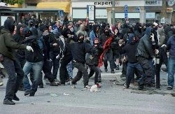 Par contre, ce qui n’a pas pu se réaliser pleinement ce fut la manifestation d’ensemble. Suite à l’incendie d’un hôtel et des fumées dégagées par cet incendie la manifestation a quittée la place - le Jardin des Deux Rives - dans la précipitation par plusieurs endroits et notamment en passant à travers deux rangées de cars de police stationnés près de la place. La police fut à la fois surprise de nous voir fuir la place enfumée par cet endroit mais aussi inquiète d’être à son tour encerclée par la masse des fuyards. Les cars furent malmenés par certains et l’affrontement qui a suivi eu pour conséquence de couper en deux la manifestation. Certains n’ont jamais pu manifester réellement.