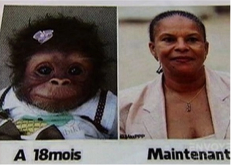 4) En octobre 2013, l’émission « Envoyé spécial » nous la montre, sûre d’elle, sans complexe, la syntaxe hasardeuse Elle préfère voir Christiane Taubira « dans un arbre après (sic) les branches que la voir au gouvernement »). Et elle la compare à un singe, montage photo à l’appui.