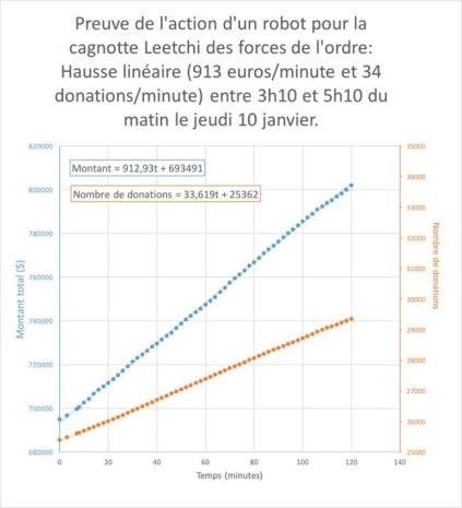 Dans la nuit du 9 au 10 janvier, un afflux considérable de donateurs, sans doute insomniaques, afflua sur le compte. Réveillé par un message privé Facebook (ding !), je notais en rafraîchissant périodiquement l’écran du site Leetchi :
