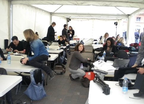 Les voitures de presse, bardées de matériel et surmontées de paraboles étaient en place depuis le matin. Tout près, un chapiteau abritait les journalistes. Une table leur offrait des douceurs peu dispendieuses : jus de fruits, eau, thé, gâteaux secs salés et ships. Les journalistes étaient à l’oeuvre, concentrés sur leurs ordinateurs portables. Je me demandais ce qu’ils écrivaient. La trame où il suffira, pour aller vite, parce que c’est la règle, de greffer quelques mots de l’orateur et des infos sur la foule ? Beaucoup étaient très jeunes, souvent des jeunes filles. Pigistes ? CDD ?