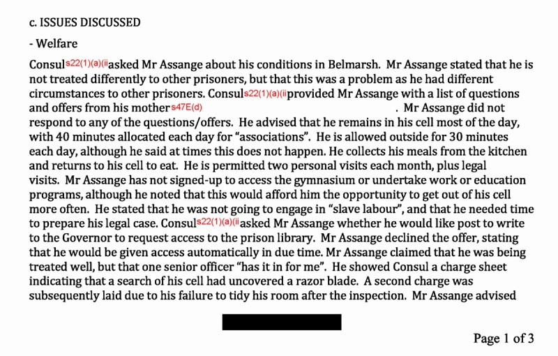 C’est ainsi que des représentants consulaires se sont rendus à Belmarsh le 1er novembre. Au cours de leur échange, Assange a critiqué les fausses déclarations faites aux médias par le DFAT, qui laissaient entendre qu’il avait rejeté leurs offres d’assistance.