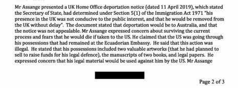 "M. Assange s’est dit inquiet de ne pas survivre à la procédure actuelle et craint de mourir s’il est emmené aux États-Unis. Il a affirmé que les États-Unis fouillaient dans ses affaires restées à l’ambassade d’Équateur. Il a déclaré que cette action était illégale", ont écrit les agents. "Il a déclaré que ses biens comprenaient deux œuvres d’art de grande valeur qu’il prévoyait de vendre pour réunir des fonds pour sa défense juridique, les manuscrits de deux livres et des documents juridiques. Il a exprimé sa crainte que ses documents juridiques soient utilisés contre lui par les États-Unis."