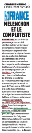 Le livre de Maxime Vivas a été commenté sur Charlie Hebdo le 7 avril 2021 par Laure Daussy dans un article d’une ignorance crasse et d’une méchanceté impeccable. Non seulement elle n’avait pas lu le livre (1), mais elle insulta l’auteur (ce « dingo ») et essaya avec un acharnement grotesque d’impliquer Mélenchon, nullement concerné, nullement cité et au courant de rien. L’auteur précise qu’il n’a même pas été destinataire d’un exemplaire en SP).