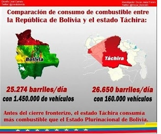 A la fermeture des postes frontières sur son territoire l’Etat du Táchira, où l’on compte 160.000 véhicules, avait une consommation d’essence plus importante que la totalité de l’Etat Plurinational de Bolivie et ses 1.450.000 véhicules.
