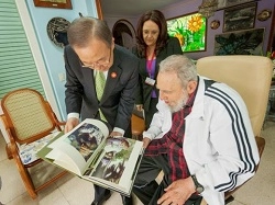 Ici on voit Fidel en compagnie du Secrétaire général des Nations Unies, Ban Ki-Moon. Ce dernier s’est dit enchanté de cette rencontre amicale où il a pu constater la grande lucidité de son hôte.