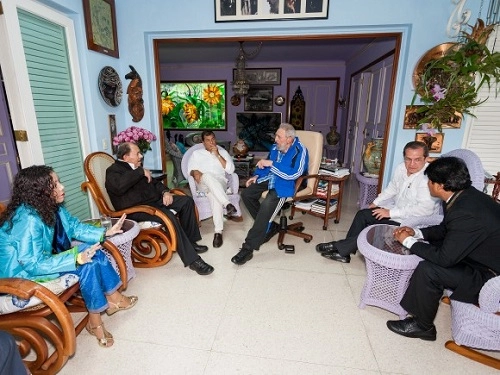 Sur cette photo, prise en marge du second sommet de la CELAC, on le voit dans sa résidence en compagnie du président de l’Équateur, Rafael Correa, de Daniel Ortega, président du Nicaragua et d’Évo Morales, président de la Bolivie. Y sont également l’épouse d’Ortega y le ministre des Relations extérieures de l’Équateur.
