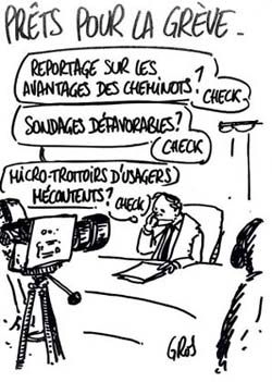Puisque qu’il a été décidé que la vérité objective et "l’opinion" sont contre les cheminots, alors tout ce qui contredit cette décision partisane qui se croit neutre est dénoncé comme ... atteinte à la liberté de la presse. Ceux dont on liquide les droits sont dénoncés comme de dangereux totalitaires. Pour l’éditorialiste du Monde, Sarkozy ne fait pas de pression sur les médias, mais les cheminots, si. Les cheminots menacent la liberté de la presse ! A quand les "journalistes" en tenue anti-émeute, appelant à tirer sur les ennemis de la liberté de la presse ?