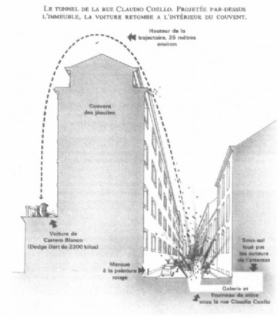le numéro 2 du régime dictatorial franquiste s’est effectivement envolé. Vers 9 heures 30, le révérend père Turpin lisait son bréviaire au couvent des Jésuites, dans la tranquille rue Claudio Coellio à Madrid. Il vit soudain passer devant sa fenêtre une Dodge noire de deux tonnes qui effectua un vol de plus de trente mètres de haut.
