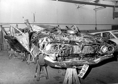Autant que je me souvienne et pour autant que je puisse encore me souvenir de quelque chose, il me semble que libé (le libé tout neuf de 1973), qui en avait fait sa première page, disait que la voiture avait été projetée à hauteur d’un 3e étage, ou quelque chose comme ça. Il me semble même qu’il y avait une photo de la voiture restée accrochée sur une corniche. Est-ce un mauvais tour que me joue ma mémoire ?