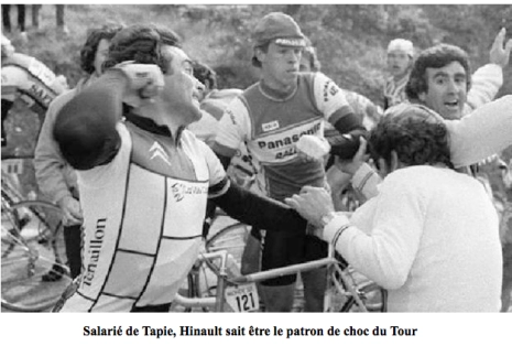 Nous sommes à une époque où, selon l’auteur, la classe ouvrière n’a pas encore été tout à fait placée « hors champ ». Ils y ont cru, ils y croient peut-être encore. On peut tout de même penser qu’ils ne sont pas tout à fait dupes du Tapie de l’époque qui s’abat, tel un charognard, sur les entreprises en difficultés et qui, en réalisant deux ou trois très gros coups dans le cyclisme français, va en changer la nature pour toujours. Hinault, LeMond et les autres vont servir et se servir de « l’artefact publicitaire », du « sponsoring » à la petite semaine, de la « glorification » de personnages complètement fabriqués. Ils seront à l’image de ce qu’en 1981 Baudrillard exprimera comme un simulacre, « une liquidation de tous les référentiels » (Simulacres et simulations).