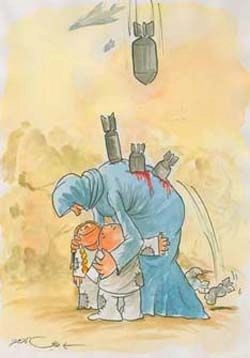 - L’ingérence humanitaire dérapa un jour lorsqu’elle se transforma en approbation explicite des bombardements massifs de la Serbie, puis de l’Afghanistan et de l’Irak ; ces enfants là qui furent broyés sous les bombes cessèrent de compter chacun pour une vie sacrée qui méritait d’être protégée...Le docteur se consolait en tentant de nous faire croire que la frappe serait « chirurgicale » destinée à éradiquer le mal et seulement le mal...Cette imposture était nécessaire pour cautionner la tragédie de la guerre sans même analyser et dénoncer la duplicité des décideurs de ces drames, aux antipodes de toute pensée humanitaire.