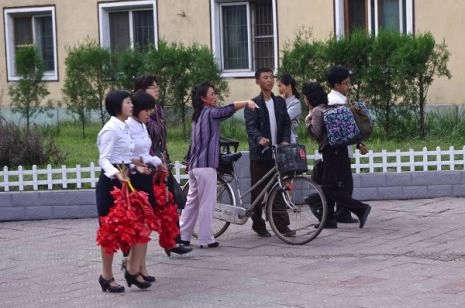 C’est ce que je vois à travers la fenêtre du minibus pendant que celui-ci roule dans Pyongyang : un pays qui n’est ni l’enfer décrit ni le paradis socialiste espéré. A l’avant du car, l’un de nos guides, Kim, prend le micro et entonne la chanson “Besame mucho” (embrasse moi beaucoup, chanson mexicaine de Consuelo Velasquez) qu’il a apprise durant ses études à Cuba. Un brin espiègle il s’amuse à emprunter les expressions typiques du parler cubain lorsqu’il s’adresse aux jeunes espagnols. A côté de moi, “Perla”, notre traductrice également, me montre une vidéo de son fils sur son portable. Elle me pose des questions sur l’Espagne et la France puis me parle du Pérou, où elle a vécu quelques années. « C’est à toi de chanter » lance Kim en tendant le micro à sa compatriote. Perla nous annonce qu’elle va nous chanter une chanson coréenne traduite à l’espagnol. « Ma bien aimée Pyongyang, tu es mon coeur, tu me manques jour et nuit, chaque fois que je me trouve loin de ma Pyongyang je t’accompagne, Pyongyang, Pyongyang... » [24].