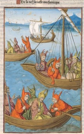 Note : antérieurement au tableau de J. Bosch, il fut publié la « Nef des folz du Monde » en 1497, traduction de « Narrenschiff » de Sébastian Brant (1494 ; ouvrage qui connut un grand succès ; il n’est pas certain que Bosch eût connaissance de ce très long poème). À ce sujet, nous pouvons lire sur http://gallica.bnf.fr/