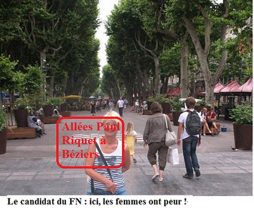 Le candidat du FN a affirmé que le centre ville de Béziers est un quartier sinistré et il a ajouté : « Je connais des jeunes femmes qui ne traversent pas les Allées Paul Riquet (ce sont les Champs Elysées de Béziers) parce qu’elles ont peur. »