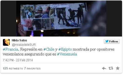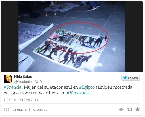 La correspondante [Hilda Salas] a signalé que la majorité des potos qui figuraient sur les pancartes [des opposants présents lors du rassemblement qui s’est tenu Place de la Bastille à Paris le samedi 22 février] correspondaient à des faits qui n’ont pas lieu au Venezuela, puisqu’il saute aux yeux très clairement qu’il s’agit de photos réelles mais prises en Egypte, au Chili, au Pérou et en Grèce.