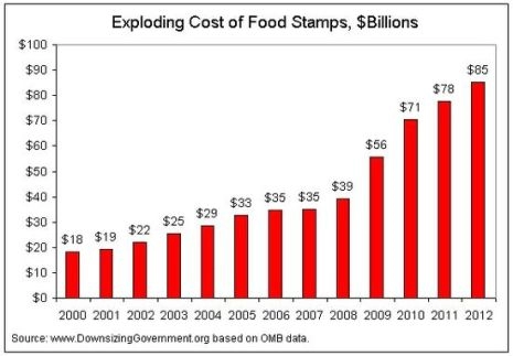 47 millions de personnes bénéficiaient de coupons alimentaires (Food Stamps) au mois d’août 2012, avec, là aussi, une belle exponentielle :