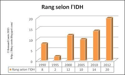 De 1995 à 2012, la France a perdu 18 places au sein du classement mondial, ce qui représente quasiment un recul d’un rang tous les ans. Si la tendance se poursuit on peut craindre que notre pays se retrouve au 60ème rang du classement selon l’IDH en 2052, c’est à dire au niveau du Panama, juste après Cuba et avant le Mexique.