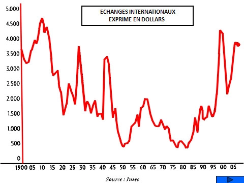 Post-scriptum 2 : Le graphique ci-dessous [17] représente l’évolution des échanges internationaux depuis 1900. On observe que le niveau actuel renvoie au niveau des échanges qui existaient avant la guerre de 1914. Voilà ce qu’est une matrice historique. On ne peut continuer à prendre des décisions aveugles, sans tenir compte de ce graphique. Marx écrivait : « celui qui ne connait pas l’histoire est condamné à la revivre ». Et souvent dans ce cadre, l’Histoire ne fait pas que se répéter à l’identique, elle bégaie (répétition en pire). Que chacun réfléchisse à la portée de ces éléments assemblés et de ces phrases, qui représente la matérialité de la matrice des siècles.