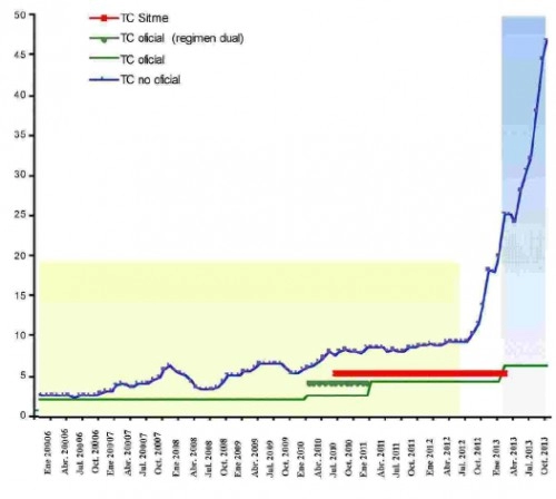 - Le cœur du problème provient de l’écart grandissant qui existe désormais entre le niveau du taux de change officiel (ou « administratif ») et le taux de change dit « de la rue ». Cet écart, resté pendant une longue période relativement faible, a commencé à s’élargir depuis 2010. Cet élargissement est devenu véritablement explosif depuis l’automne 2012. Dans cette situation, avec un écart entre les deux taux de change qui atteint désormais 9/1, les activités économiques sont profondément et durablement déformées. La spéculation des agents privés sur ces taux de change affecte tous les secteurs de l’activité et devient une source majeure d’enrichissement pour une petite minorité. Le fait que les activités économiques s’orientent autour de la différence des deux taux de change est aussi une source supplémentaire d’élargissement de l’écart, car il se traduit par une augmentation des montants en bolivars qui alimentent le taux de change de la rue. Tout cela aboutit à un affaiblissement profond de la confiance du peuple vénézuélien dans sa monnaie, ce qui a des conséquences économiques, mais aussi politiques et psychologiques, qui sont potentiellement dramatiques.