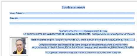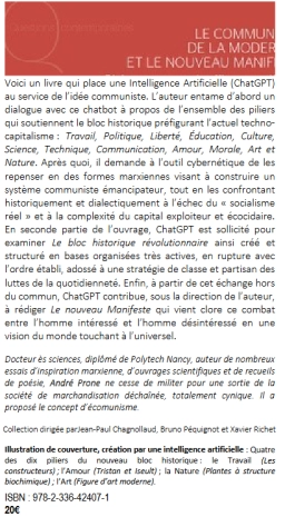 Piqué au vif par la curiosité, de fil en aiguille, m’approchant de cette intelligence artificielle, je décidais d’entrer en dialogue avec ce chatbot et, passé la période d’apprentissage sur le fonctionnement de l’outil, me voilà en mesure de vous présenter mon nouveau livre paru ce jour chez l’Harmattan : « Le Communisme de la modernité et Le Nouveau Manifeste, Dialogue avec une Intelligence Artificielle ».