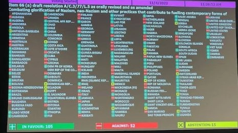 L’article du PRCF mentionné plus haut note que « si les pays du bloc atlantiste ont quasi tous voté contre, Israël a, elle, une nouvelle fois voté POUR la résolution, démontrant le caractère fallacieux des arguments avancés par les pays qui s’y opposent ».