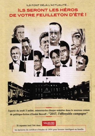 Observons ci-dessous l’affiche d’auto-promotion de Valeurs Actuelles. On nous annonce un feuilleton tiré du roman d’André Bercoff : 2017, l’effroyable campagne. Je passe rapidement sur le fait que le choix d’André Bercoff est fortement orienté vers le sulfureux et le “ virons à droite tant qu’on peut ”. Un des derniers exploits littéraires de cet homme de lettres multi-cartes est d’avoir préfacé Apéro saucisson-pinard. L’islam, un débat qui rassemble.