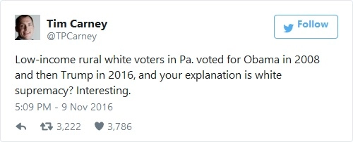 Pour commencer, il faut admettre que non seulement Barack Obama a été élu deux fois, mais il est sur le point de quitter ses fonctions comme un président hautement populaire : il est actuellement perçu plus positivement que Reagan. Les États-Unis n’étaient pas moins racistes et xénophobes en 2008 et 2012 qu’aujourd’hui. Même les inconditionnels démocrates qui aiment cataloguer leurs adversaires en intolérants reconnaissent qu’il faut une analyse bien plus complète pour comprendre les résultats d’hier soir. Comme l’a dit Nate Cohn du New York Times : « Clinton a subit ses plus grosses pertes là où Obama était au plus haut parmi les électeurs blancs. Ce n’est pas une simple histoire de racisme. » Matt Yglesias a reconnu que la cote de confiance élevée d’Obama contredit le portrait qu’on fait des États-Unis comme d’un pays « aveuglé par le racisme ».