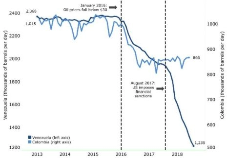 La production annuelle de pétrole a chuté de 30,1 % en 2018, contre 11,5 % en 2017. (8) La différence dans ce taux implique une perte d’environ $8,4 milliards en devises étrangères dont l’économie vénézuélienne a désespérément besoin pour ses importations essentielles comme les médicaments et les aliments.