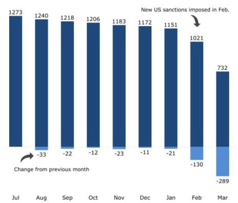 Grâce à ces efforts et à d’autres, la production pétrolière du Venezuela a diminué de 130 000 barils par jour de janvier à février. Au cours des six mois précédents, elle avait diminué en moyenne de 20 500 barils par jour. Puis, en mars, elle a encore chuté de 289 000 barils par jour, pour un total de 431 000 barils par jour. Il s’agit là d’une chute dévastatrice de 36,4 % de la production pétrolière depuis les sanctions de janvier.