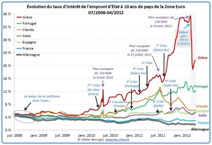 Ce graphique visualise la « violence barbare » des marchés en crise. Plus tu es fragile, plus tu payes. Mais les marchés sont prêts à pactiser avec les puissances dominantes (France-Allemagne) car elles entérinent politiquement la violence des marchés en crise et la justifient sur les peuples plus faibles. Ils démontrent que l’Europe n’est pas un espace de solidarité. La seule solidarité existante, c’est celle de la commission européenne avec les banques et les marchés financiers. Quand, les marchés boivent le « champagne du business », accumulant les bulles spéculatives, les peuples dégustent.